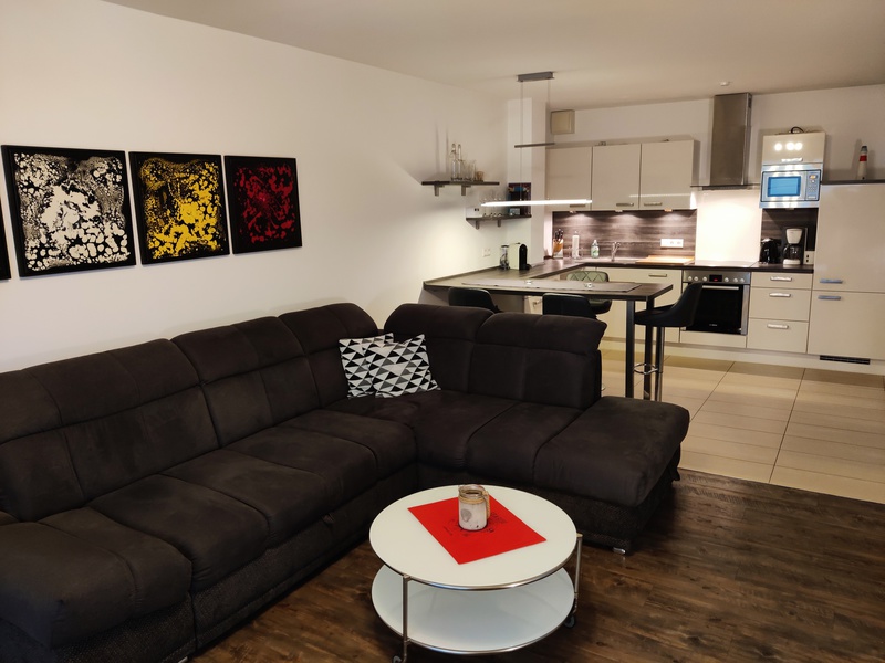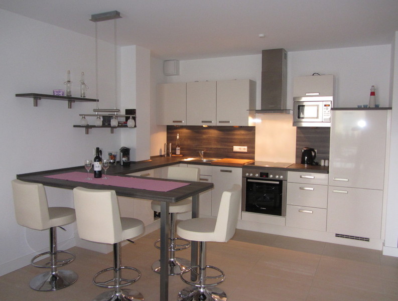 Die Einbauküche ist voll ausgestattet mit Geschirrspüler, Mikrowelle, Cerankochfeld, Backofen, Dunstabzugshaube, Kühl- Gefrierkombination, Nespressomaschine, Wasserkocher und Toaster. Die Küche ist durch einen Tresen (mit 4 bequemen Tresenstühlen) vom Wohnbereich getrennt.