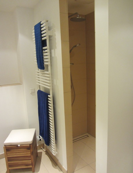 Unser großzügiges Duschbad ist mit bodengleicher Dusche, Waschtisch, Handtuchtrockner und Fön ausgestattet.